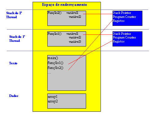 endereçamento. Com vários threads, temos em qualquer instante vários pontos de