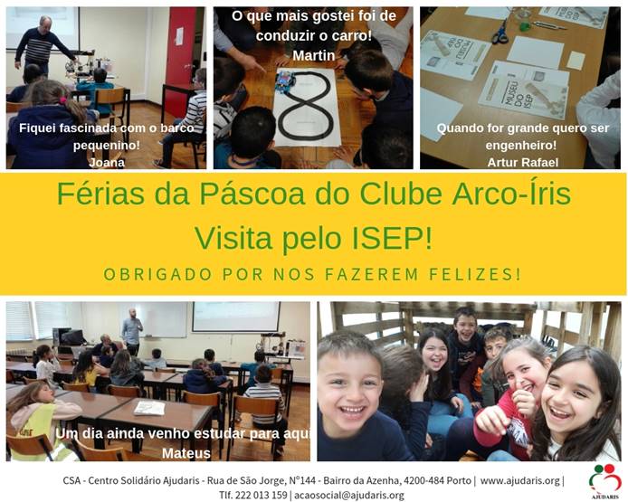 A Associação Ajudaris vem por este meio agradecer todo o carinho e disponibilidade na dinamização da atividade para as crianças do Clube Arco-Íris, durante as Férias da Páscoa. Estamos muito agradecidos pela importante colaboração, este gesto enche-nos de orgulho e satisfação!