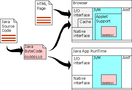 Fist we have the Java Source Code that is compiled into Java ByteCode using an Java Compiler like the one included in JDK or Visual J++.