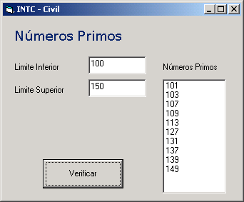 Option Explicit Private Sub cmdVer_Click() Dim inf As Long, sup As Long, k As Long Dim aux As Long, num As Long lstNP.Clear inf = Val(txtLI.Text) sup = Val(txtLS.Text) If sup < inf Then aux = inf inf = sup sup = aux End If If inf <= 0 Then MsgBox "Os limites estão errados!" Exit Sub End If For num = inf To sup k = 2 Do While k <= num \ 2 And num Mod k <> 0 k = k + 1 Loop If k > num / 2 Then lstNP.AddItem num End If Next End Sub