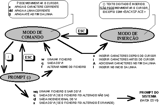 Se nome-ficheiro existe será editado, caso contrário será criado. Seja como for quando o vi arranca fica em modo de comando. Recorda-se que em UNIX os caracteres maiúsculos e minúsculos têm significados diferentes. Por esta razão desaconselha-se a utilização do "CAPS LOCK" no vi já que pode gerar alguma confusão ao digitar teclas de comando que têm significados diferentes conforme sejam maiúsculas ou minúsculas. |
