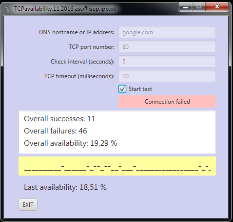 The program periodically tries to establish a TCP connection with a designated server port. It registers successes and failures to determine the availability.
