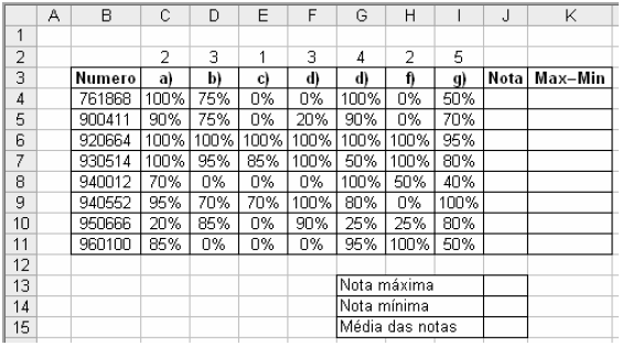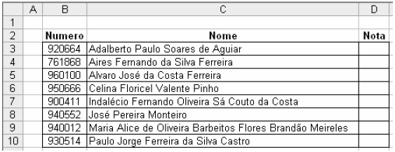 1) Considere o seguinte livro Excel constituído pelas folhas de cálculo Pauta e Exame (ver Fig. 1 e Fig. 2). ![]() Fig. 1 . Folha de cálculo Pauta ![]() Fig. 2 - Folha de cálculo Exame b) Calcule, através de fórmulas, a nota máxima, a nota mínima e a média das notas na folha Exame. c) Preencha a coluna Max-Min da folha Exame com uma fórmula que coloque a palavra máximo ou mínimo nas células apropriadas e texto vazio nas restantes células. d) Elabore um gráfico .de linha. das notas de todos os alunos. e) Elabore um gráfico de distribuição das notas pelos seguintes intervalos: Intervalo de 0 a 5; Intervalo de 6 a 9; Intervalo de 10 a 14; Intervalo de 15 a 17; Intervalo de 18 a 20. Determine também o número total de notas. f) Coloque automaticamente, na folha Pauta, as notas de exame dos alunos (use a função vlookup); g) Elabore, numa nova folha de cálculo, um gráfico da função seno no intervalo [0º,360º]. h) Na folha Pauta crie dois botões associados a duas macros gravadas, em que uma ordena a pauta por número e a outra por nome. © 2004-2005 Luis Marques Act. em 21/02/2005 |