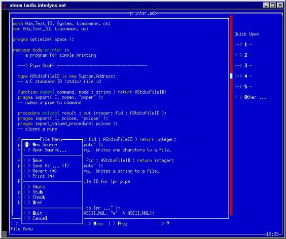 TIA, Tiny IDE for Ada, is a console IDE for Gnat. Besides being my own program, it was written using Gnat runs using the GPL texttools packages described later in this document. The screen layout is similar to pico's, with the menu options displayed along the bottom of the screen. If you are running on the Linux console or a xterm window, you can choose the menu items with alt key combinations or using your mouse.