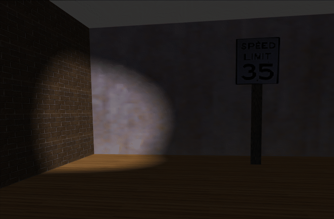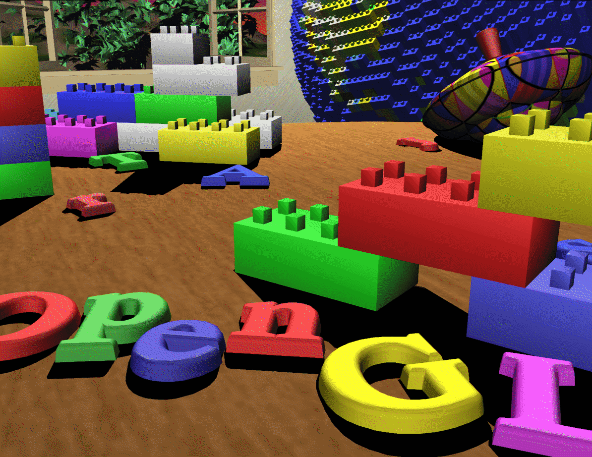 Sophisticated use of texturing. All surfaces are texture-mapped. In addition, the attenuated spotlight effect is created using a projected texture. See Chapters 9 and 14.