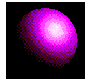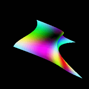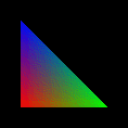 A smooth-shaded triangle. The three vertices at the corners are drawn in red, green, and blue; the rest of the triangle is smoothly shaded between these three colors. See Chapter 4.