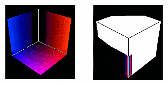 The color cube. On the left, the red, green, and blue axes are shown; on the right, the axes denote yellow, cyan, and magenta. See Chapter 4.