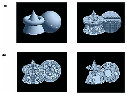 Objects drawn with gray material parameters and colored light sources. (a) The scene on the left has pale blue ambient light and a white diffuse light source. The scene on the right has a pale blue diffuse light source and almost no ambient light. (b) On the left, an infinite light source is used; on the right, a local light source is used. With the infinite light source, the highlight (specular reflection) is centered on both the cone and the sphere because the angle between the object and the line of sight is ignored. With a local light source, the angle is taken into account, so the highlights are located appropriately on both objects. See Chapter 5.