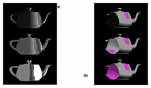 Gray teapots drawn with different lighting conditions. (a) Each of the three teapots is drawn with increasing ambient light. (b) The teapots are clipped to expose their interiors. The top teapot uses one-sided lighting, the middle one uses two-sided lighting with the same material for both front and back faces, and the bottom teapot uses two-sided lighting and different materials for the front and back faces. See Chapter 5.