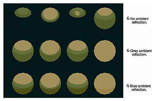 Twelve spheres, each with different material parameters. The row properties are as labeled above. The first column uses a blue diffuse material color with no specular properties. The second column adds white specular reflection with a low shininess exponent. The third column uses a high shininess exponent and thus has a more concentrated highlight. The fourth column uses the blue diffuse color and, instead of specular reflection, adds an emissive component. See Chapter 5.
