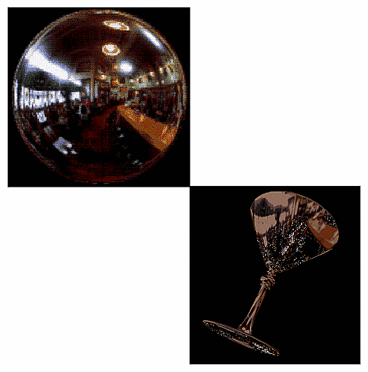 An environment-mapped object. On the left is the original texture, a processed photograph of a coffee shop in Palo Alto, taken with a very wide-angle lens. Below is a goblet with the environment map applied; because of the mapping, the goblet appears to reflect the coffee shop off its surface. See Chapter 9.