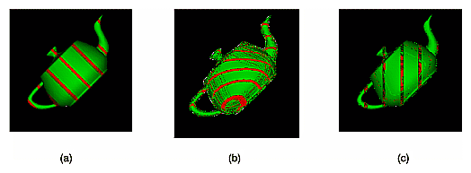 Lighted, green teapots drawn using automatic texture-coordinate generation and a red contour texture map. (a) The texture contour stripes are parallel to the plane x = 0, relative to the transformed object (that is, using GL_OBJECT_LINEAR). As the object moves, the texture appears to be attached to it. (b) A different planar equation (x + y + z = 0) is used, so the stripes have a different orientation. (c) The texture coordinates are calculated relative to eye coordinates and hence aren't fixed to the object (GL_EYE_LINEAR). As the object moves, it appears to “swim” through the texture. See Chapter 9.
