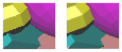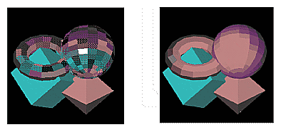A scene with several flat-shaded objects. On the left, the scene is aliased. On the right, the accumulation buffer is used for scene antialiasing: the scene is rendered several times, each time jittered less than one pixel, and the images are accumulated and then averaged. See Chapter 10.