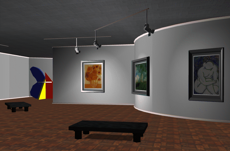 A scene drawn with texture mapping, lighting, and shadows. The paintings, floor, ceiling, and benches are texture-mapped. Note the use of spotlights and shadows. See Chapters 5, 9, and 14.