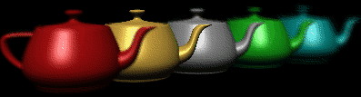 Teapots drawn with jittered viewing volumes into the accumulation buffer for a depth-of-field effect. The gold teapot is in sharpest focus.