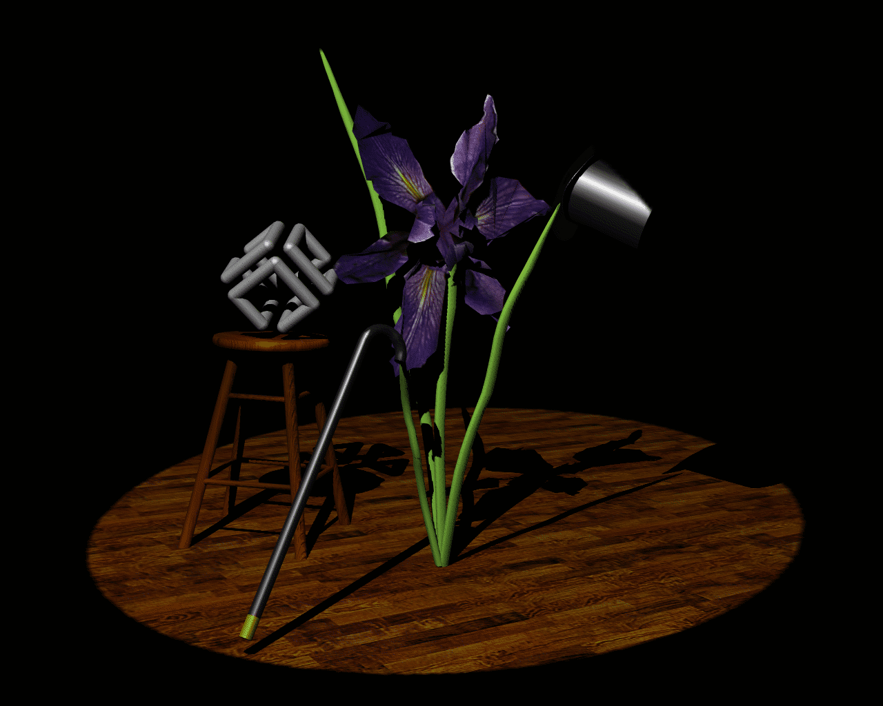 A dramatically lit and shadowed scene, with most of the surfaces textured. The iris is a polygonal model. See Chapters 2, 5, 9, and 14.
