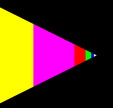 A single polygon drawn using a set of mipmapped textures. In this case, each texture is simply a different color. The polygon is actually a rectangle oriented so that it recedes into the distance, appearing to become progressively smaller. As the visible area of the polygon becomes smaller, correspondingly smaller mipmaps are used. See Chapter 9.