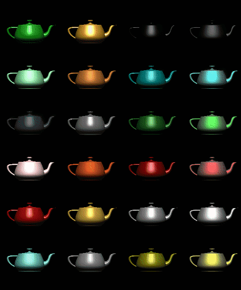 Lighted, smooth-shaded teapots drawn with different material properties that approximate real materials. The first column has materials that resemble (from top to bottom) emerald, jade, obsidian, pearl, ruby, and turquoise. The second column resembles brass, bronze, chrome, copper, gold, and silver. The third column represents various colors of plastic: black, cyan, green, red, white, and yellow. The fourth column is drawn with similar colors of rubber. See Chapter 5