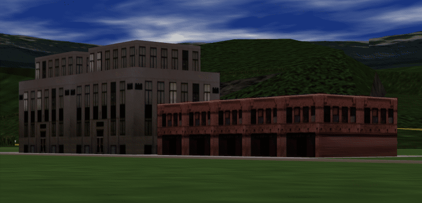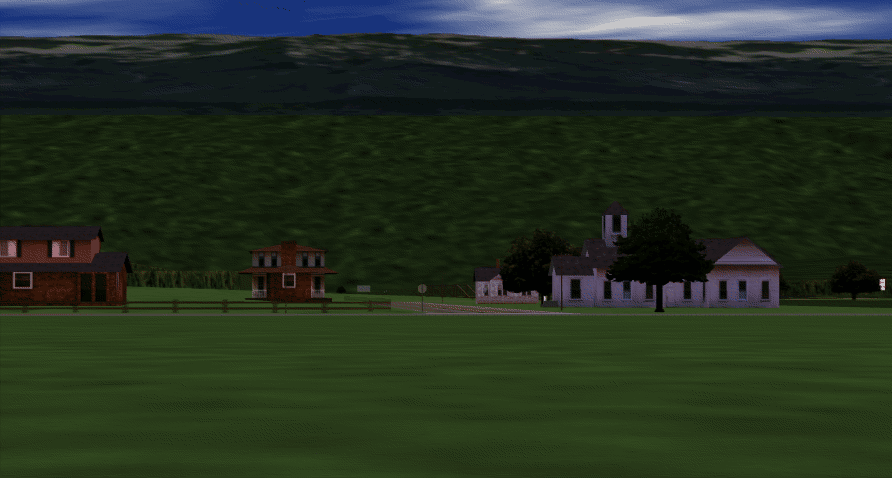 Two scenes snapped from a visual simulation program. The hills are composed of just a few polygons, but all the polygons are texture-mapped. Similarly, the buildings are composed of only a few textured rectangular walls. See Chapters 2, 3, and 9.