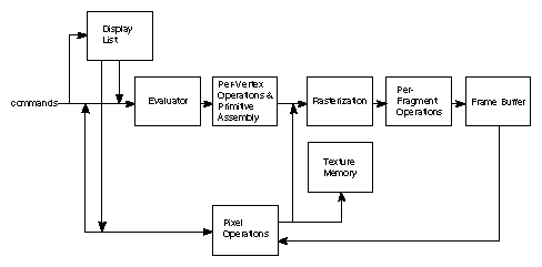 The figure shown below gives an abstract, high-level block diagram of how OpenGL processes data. In the diagram, commands enter from the left and proceed through what can be thought of as a processing pipeline. Some commands specify geometric objects to be drawn, and others control how the objects are handled during the various processing stages.
