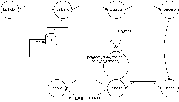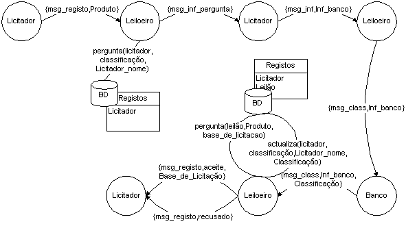 Leiloeiro | Licitador, de quem recebe licitações e lhe envia os valores das licitações aceites no leilão e a quem envia informação de actualização das licitações. | Produto, nomeadamente a base de licitação |