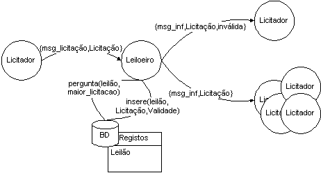 Nota: Como simplificação do problema, parte-se do princípio que não ocorrem continuamente mensagens inválidas (no que respeita ao valor de licitação). Se assim não fosse, o processamento de timeout's não deveria ser processada assim mas através de timer's, que disparam mensagens específicas pelo que o sistema não seria afectado por mensagens inválidas.