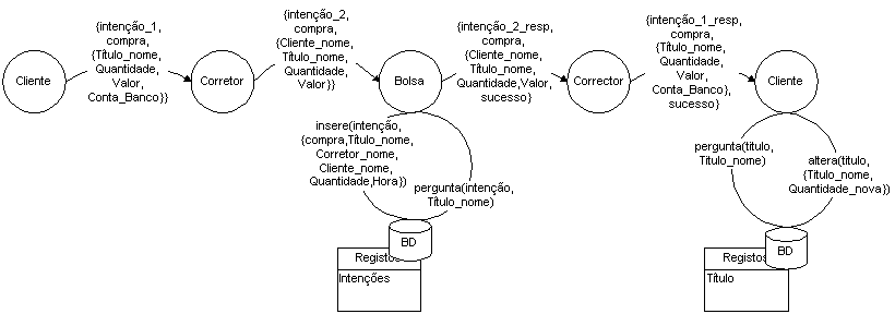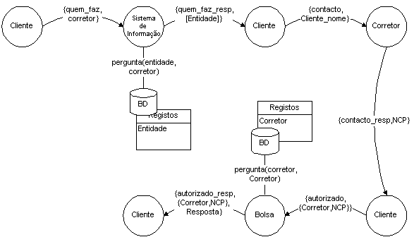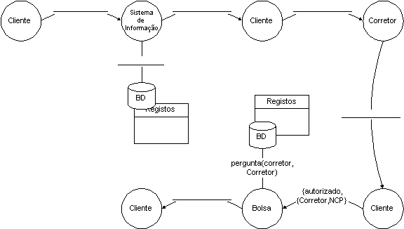 Cliente | Corretor: (já descrito); Bolsa: (já descrito); Banco: O cliente tem uma conta num banco através da qual será efectuada a transacção financeira com a bolsa (via corretor). |